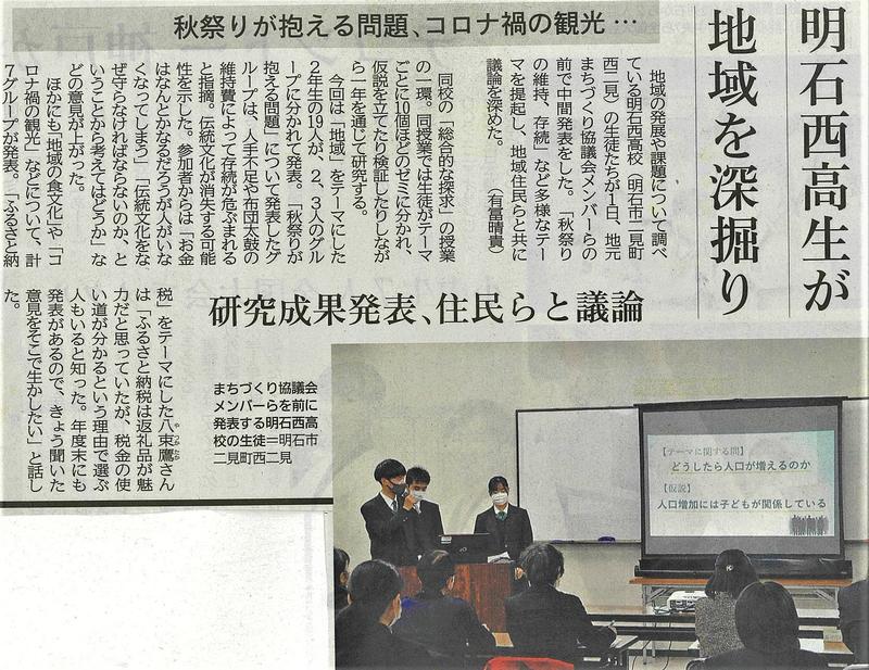 教育類型1年生「ミニティーチャー体験」の新聞記事 投稿日時 : 2023/06/21 明石西高校教員 カテゴリ:新聞記事 教育類型1年生の、二見こども園での「ミニティーチャー体験」に関する記事が、神戸新聞の6月21日(水)朝刊に掲載されました。 (画像をクリックするとPDFファイルが開きます) 一つ前の話題は、熱中症予防講演会についてです。下の番号をクリックしてください。