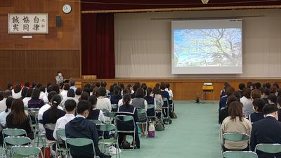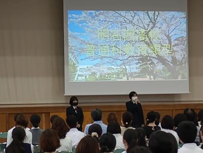 5月14日(土)、本校体育館で教育類型説明会を行いました。約200名の方の参加をいただきました。担当職員による教育類型についての説明に加えて、ディベートや行事の様子を映像でご覧いただきました。また、教育類型の生徒がクラスの様子や受験を決めた理由などについて発表を行いました。司会や案内・誘導なども教育類型の生徒が担当しました。参加いただいた中学生とその保護者の皆様、ありがとうございました。
