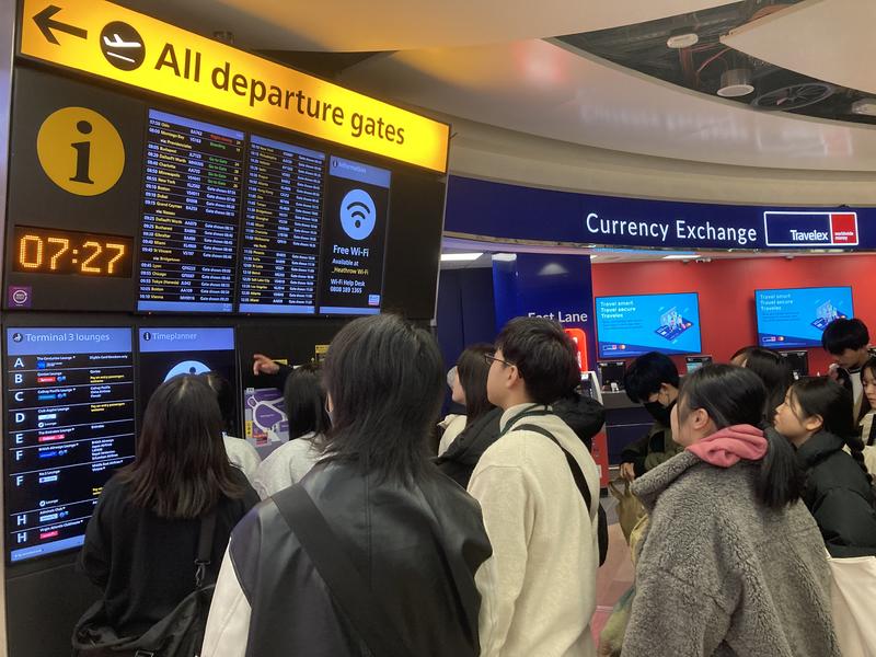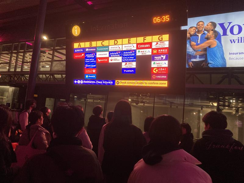 明石西高校国際人間科の研修団を長年引率していただいている、添乗員の方から、空港での掲示板の見方を教わっています。次に一人でも動けるよう、鍛え育てていただいています。