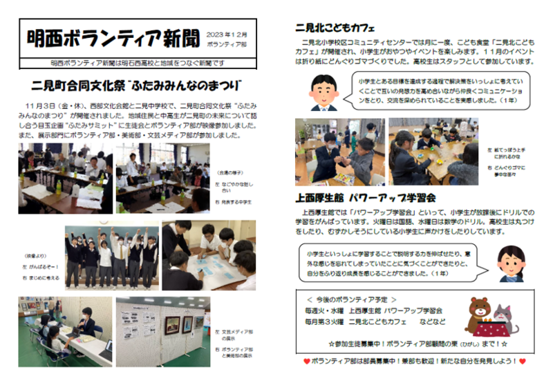 ボランティア新聞12月号を発行しました 投稿日時 : 2023/12/22 明石西高校教員 カテゴリ:ボランティア部 ボランティア新聞12月号を発行しました。二見町合同文化祭“ふたみみんなのまつり”に参加しました。 ボランティア新聞12月号.pdf