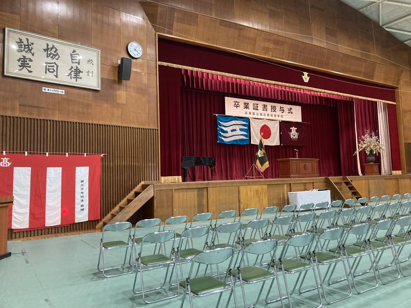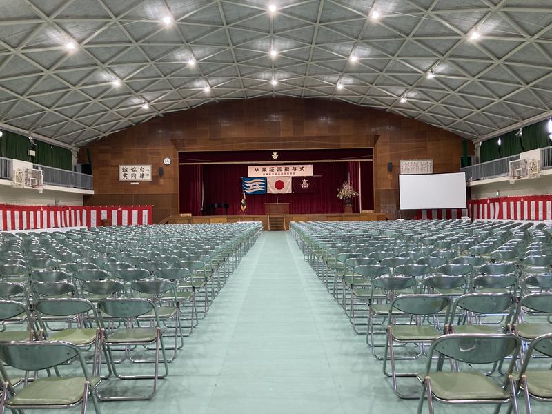2月27日は、同窓会入会式、卒業記念品贈呈式、各種表彰式、卒業式予行が行われます。そして、翌28日は第46回卒業証書授与式です。26日は学年末考査期間の最中ですが、先生方、在校生達が時間を使って会場の準備をしてくれました。晴れやかに卒業生の皆さんを送る準備を整えています。