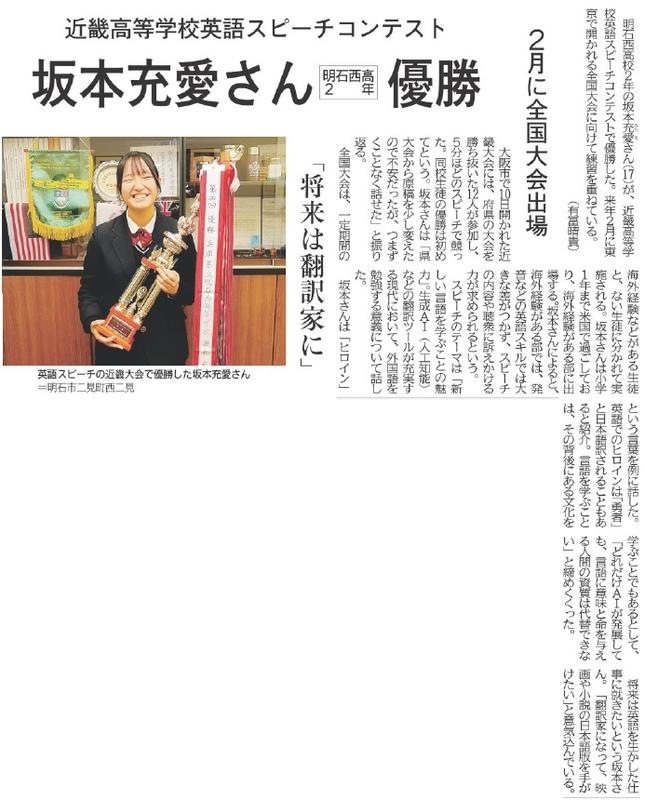 明石西高校国際人間科2年、坂本充愛さんが見事に優勝しました。新しい言語を学ぶことの魅力について、大変説得力のあるスピーチでした。