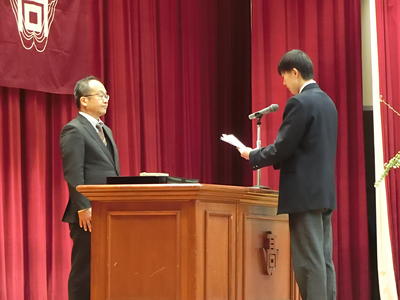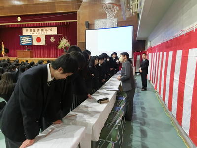 卒業式に先立ち、3年生の同窓会入会式、記念品贈呈式、学校賞(若鷲賞)・皆勤賞の表彰式が挙行されました。