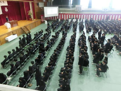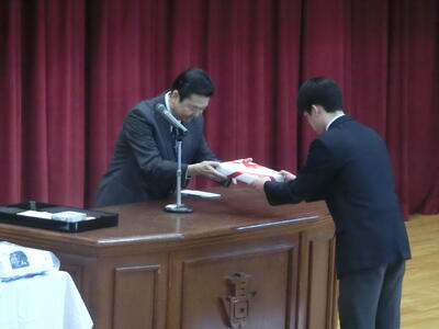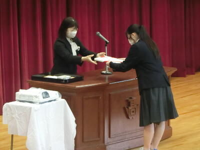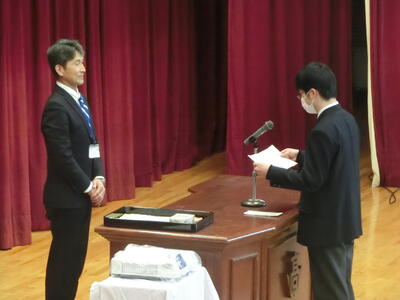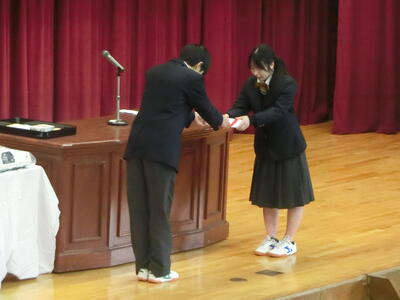 記念品は、卒業生から学校へ「プロジェクタ・Apple TV」、PTAから卒業生へ「卒業証書入れ」、同窓会から卒業生へ「印鑑」、生徒会から卒業生へ「携帯救急セット」がそれぞれ贈られました。表彰式では、若鷲賞(部活動・検定試験で顕著な成績を収めた生徒)32名、皆勤賞17名が表彰されました。