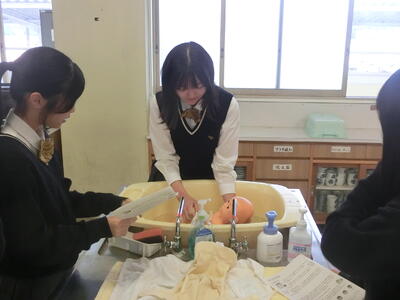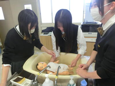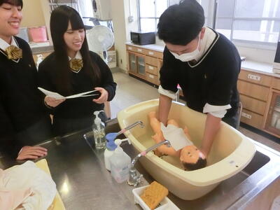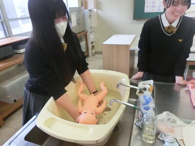 赤ちゃんの人形を使い、沐浴の練習をしています。