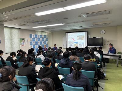 最初に池田市にある猪名川河川事務所で、概要説明を聞き、測量についてのお話しを聞きました。
