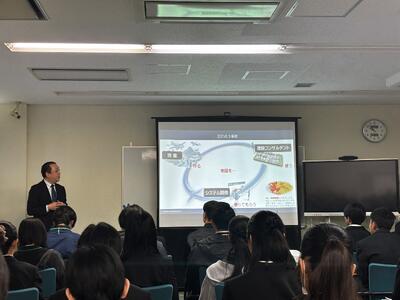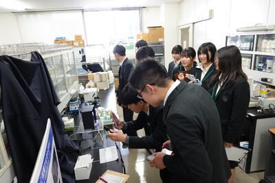 午後は甲南大学フロンティアサイエンス学部で模擬講義「化学と生物学をエネルギーの視点で考えてみよう」とキャンパスツアーに参加しました。高校では見ることのできない実験器具に生徒も驚きながら最新の設備を見学することができました。