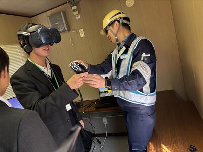 ここはまもなく工事が行われる場所で、工事車両はまだ搬入されていませんでしたが、事務所内にゲーミングコンピュータやVRゴーグルなどがあり、工事現場のシミュレーションが体験できました。工事現場の安全教育等に利用されているそうです。