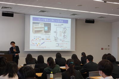 午前は理化学研究所で「個体の始まりから終焉までに起きている生命現象を正確に知る」「健康・正常状態の理解と、老化・寿命制御メカニズムを解明する」という内容で高校生でも分かりやすいような様々な研究内容について講義していただきました。また、ギャラリーでは実際にiPS細胞や研究に使用されている生物を観察するなど、実際の研究現場を体験することができました。