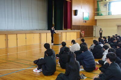 諸注意の後、修学旅行委員が修学旅行を楽しもうという声かけに対してみんなが元気に返事をしてくれました。