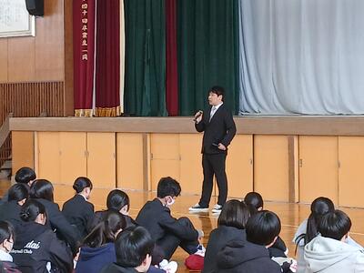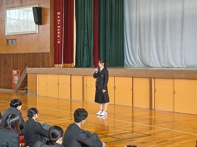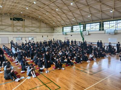 学年集会では、各クラスの委員長または副委員長による1年間の振り返り、およびスクランブルコンテストの表彰、無欠席(無遅刻無早退)者の紹介がありました。