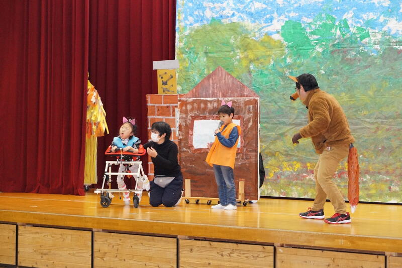 小学部は『みる・きく・はなす』の授業で行った『3びきのこぶた』のお話にちなんで、子どもたち6人がこぶたに扮し、オオカミからのミッションを一人一人クリアしながらオオカミを追い払っていくお話を披露しました。一人一人が自分のすべきことを理解して、堂々と発表することができました。