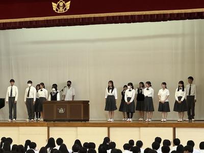 続いて、表彰伝達と第50期生徒会執行部解任式および第51期生徒会執行部認証式がありました。表彰伝達で登壇した生徒19名の生徒は、みな誇らしげに表彰状を受け取っていました。新旧の生徒会執行部の皆さんも壇上で勢ぞろいしました。第50期生徒会長の亀山さん、第51期生徒会長竹ノ内くんの挨拶もありました。