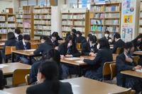 司書の尾住先生より、図書室の利用方法や配置案内を教えていただき、実際に本を手に取って閲覧したり、図書室内にあるソファーに座って体感したり楽しめたようです。中には早速本を貸出し希望している生徒もいました。