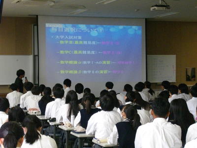 2年次教科別科目選択ガイダンス 投稿日時 : 2023/07/14 教務部 カテゴリ:授業の様子 7月13日(木)に、3年次の選択科目についての説明を各教科から行いました。 2年次は2度目の科目選択ですが、自分の「進路」や「興味」に合わせて再度考えてほしいと教務部から伝えました。 2年次は、9月から仮登録をしていきます。夏休み中に自分の希望する進路と合わせて、選択する科目についてもしっかりと考えましょう。 ガイダンスの風景1 ガイダンスの風景2 ガイダンスの風景3 タグ 一人一人の時間割