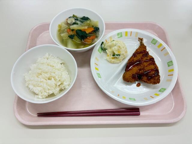 ごはん あじフライ ポテトサラダ 肉団子(にくだんご)スープ