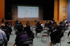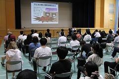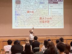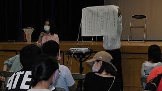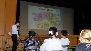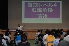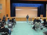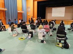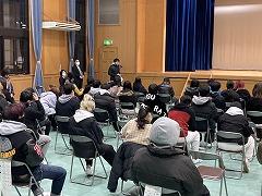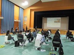 体育館では、南海トラフ地震や学校周辺の避難場所等について学びました。