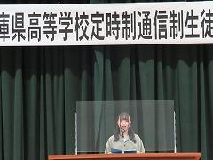 発表者順にクラスと題名を紹介します。2年1組「湊川高校に入学してよかったこと」、1年2組「友達の力」、3年1組「私」、1年1組「支えがある嬉しさ」、2年2組「夢」、3年2組「コロナで変わった日々」。