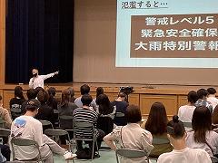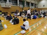 緊急地震速報のアラームの後、シェイクアウト(揺れに備えて机の下で頭を守るなど)したのち、雨天のため体育館で防災講話、避難時間の確認などを行いました。