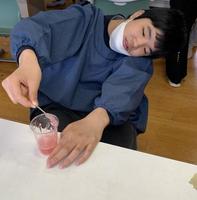 中学部1年ではリサイクルについて学習し、その体験として紙のリサイクルに取り組んでいます。お茶の紙パックを切り、パックに密着しているフィルムをはがして紙を取り出す作業に取り組んでいます。2学期にはその紙をミキサーにかけてパルプにして紙すきをする予定です。慣れない作業でしたが、みんな真剣に取り組んでいました。