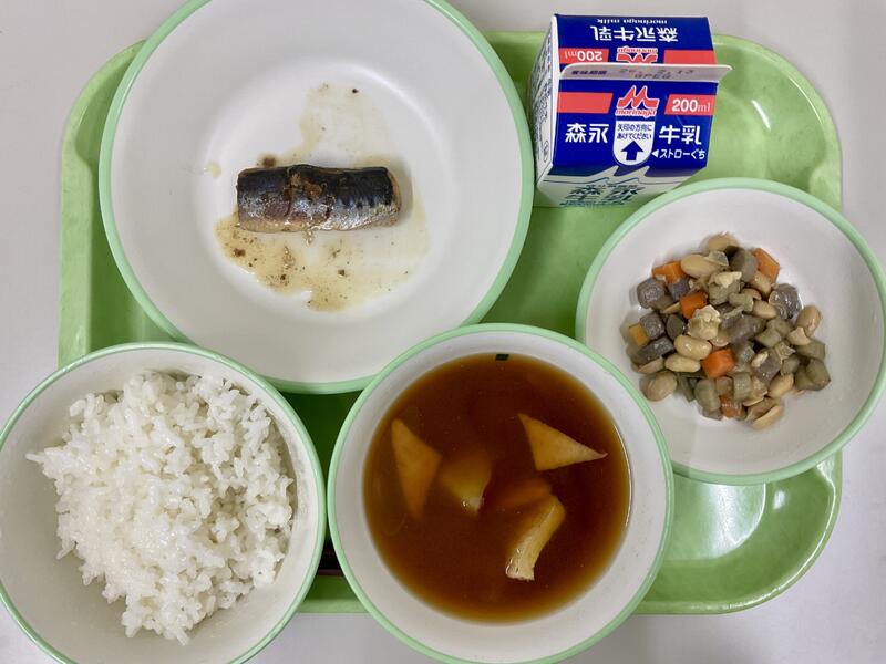【献立】ごはん、いわしの梅煮、五目大豆、さつまいものみそ汁、牛乳