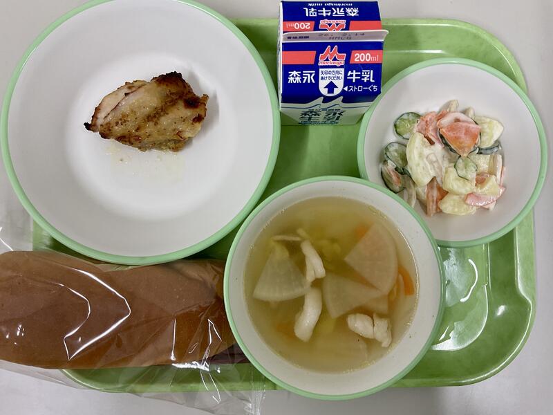 【献立】コッペパン、ハニーマスタードチキン、ポテトサラダ、野菜スープ、牛乳