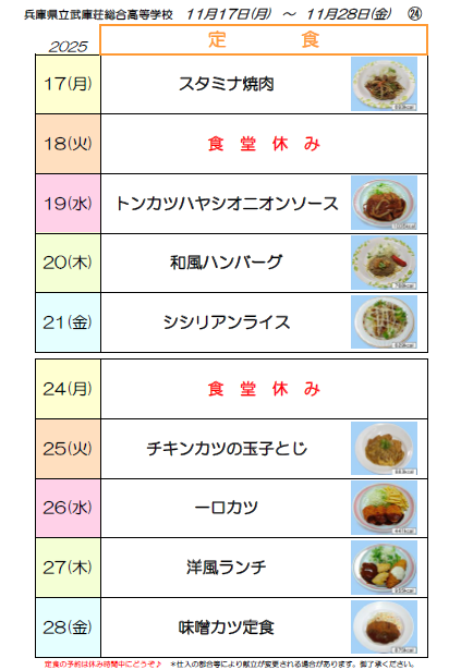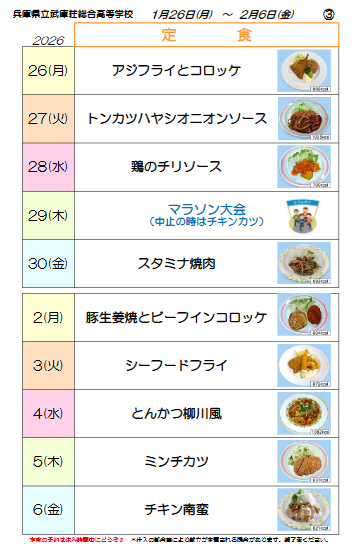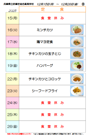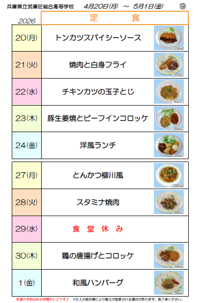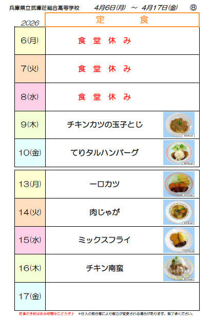 ・2週間ごとのメニューを掲示しています。食べたいメニューの日は予約に来てくださいね!