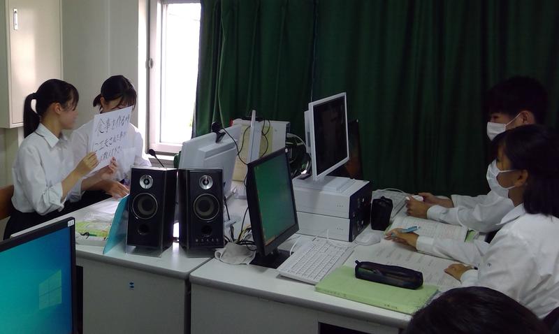 今日は夏休みから各自で研究してきたテーマを班別にまとめ、総合人間類型のクラス全員に対して発表会を行いました。班員全員が情報教室の前面に立ちました。