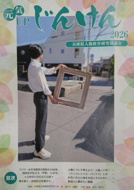 9月号で紹介した、放送部がテレビドキュメント作品「継(つぐ)」は、現在においても各方面から上映のお願いと、放送部の声を聞きたいとのご依頼が引きも切らず、その中に「元気UP じんけん 2026」(編集・発行兵庫県人権教育研究議会)の表紙に本校生徒の作品を使っていただき、巻頭3ページで放送部へのインタビュー記事を掲載いただいたことを紹介しました。