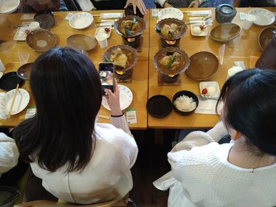 振り返ると、みなさんお土産選びに夢中です。クラス写真を撮影して昼食会場に移動します。