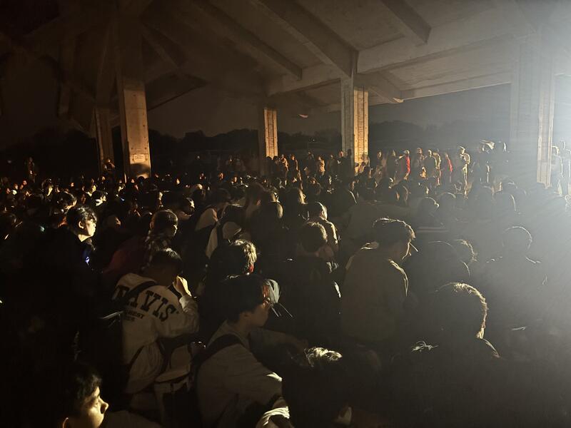 小雨が降っていますが、生徒たちは沖縄の暖かさに驚いている様子でした。