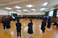 後半は卓球場に移動して、3年生の司会・進行による仲間作りタイムです。列並びゲームからスタートし、1つの大きな円になったところで自己紹介。その後も、じゃんけん列車やジェスチャーゲームなどで盛り上がりました。続いての質問・相談コーナーでは、グループに分かれて先輩から様々なアドバイスが。そして最後に1年生代表が謝辞を述べ、終了となりました。