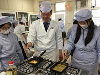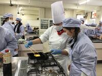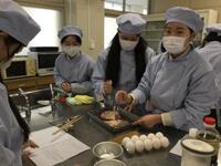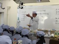 包丁の種類や有馬焼の由来、五味、対比効果・相乗効果など教えていただきました。実習では、鶏の焼き方、出し巻き卵の焼き方のコツを生徒たちは熱心に見て聞いてメモを取っていました。