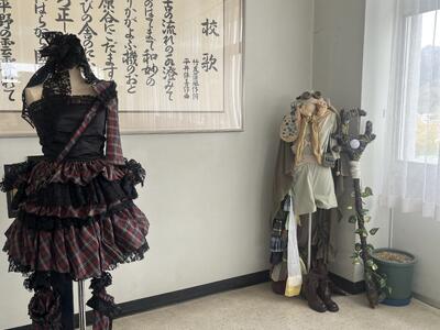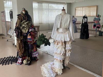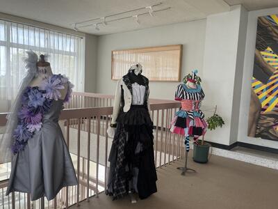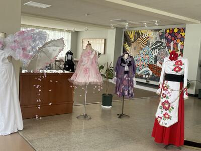 同じくピロティには、生活情報科3年生が卒業制作として手掛けた衣装も展示しています。細部までこだわり抜かれたデザインや色鮮やかな生地の重なりなど3年間の学びの集大成ともいえる作品が並び、空間を華やかに彩っています。