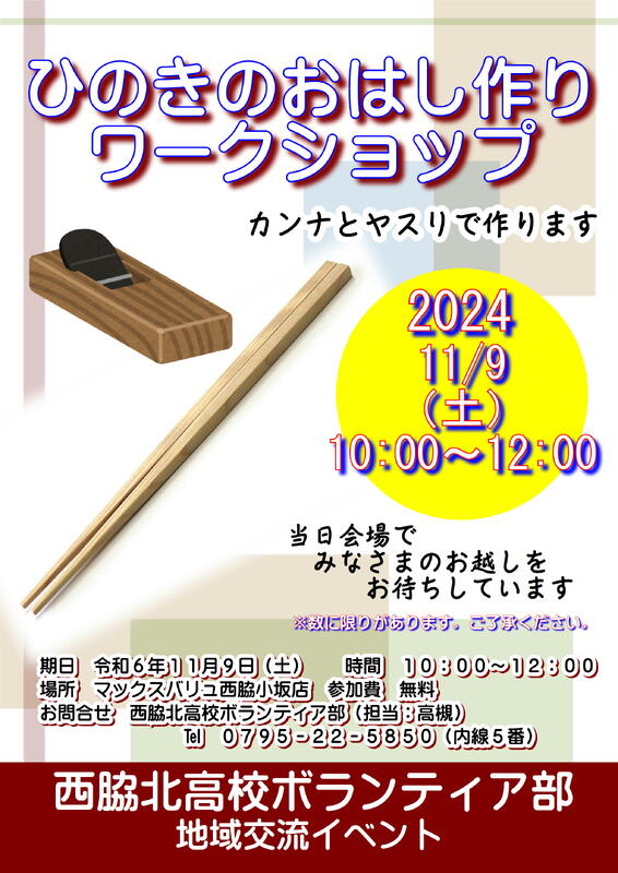 ボランティア部 ヒノキのお箸づくりワークショップ実施します