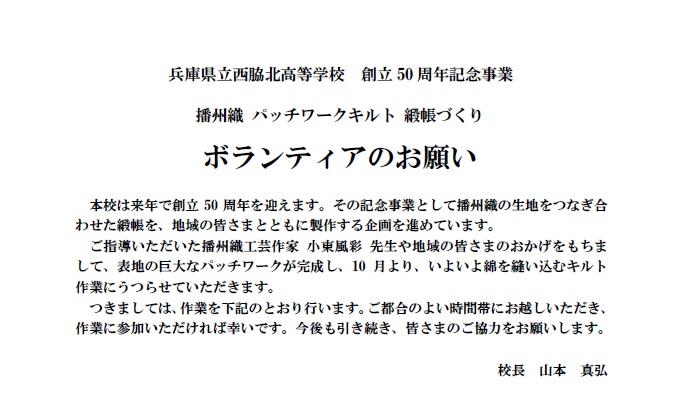 開会式では、山本真弘校長の挨拶のあと、片山象三西脇市長から激励の言葉をいただきました。その後、パッチワークの指導をしていただいている小東風彩先生のご挨拶と作業に関する説明を受けて、地域の方々と本校の生徒会と職員が中心となって作業に取り掛かり、キルトを繋ぎ合わせることができました。