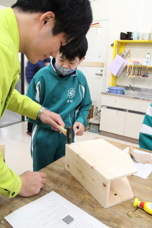 その後は、山崎高等学校の生徒たちが主体となって、本校生徒とペアになってファイルケース作りをしました。どこを紙やすりで磨くか、どこに木工ボンドを塗るかなど丁寧に教えてくれました。一番難しかったのは、金づちを使って、釘を打つことでした。山崎高等学校の生徒たちに、釘や板を支えてもらったりしながら、たくさん褒めていただき、時間内になんとか仕上げることができました。あっという間に時間が過ぎ、「もっといろいろな話をしたかった。」という感想を言う生徒もいました。