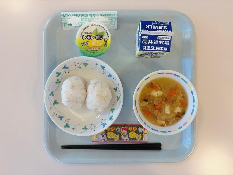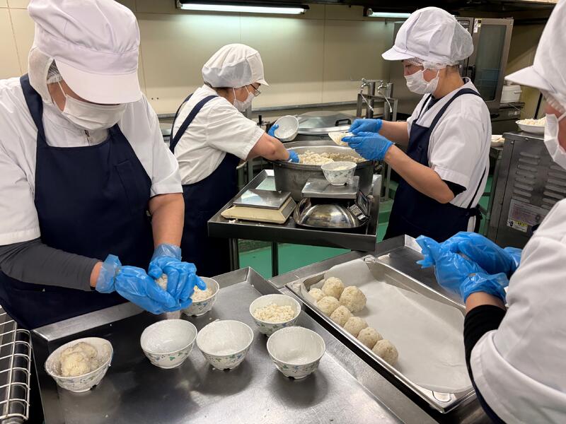 今日の給食のおむすびは調理員が朝から全校分約600個をひとつずつ握りました。
