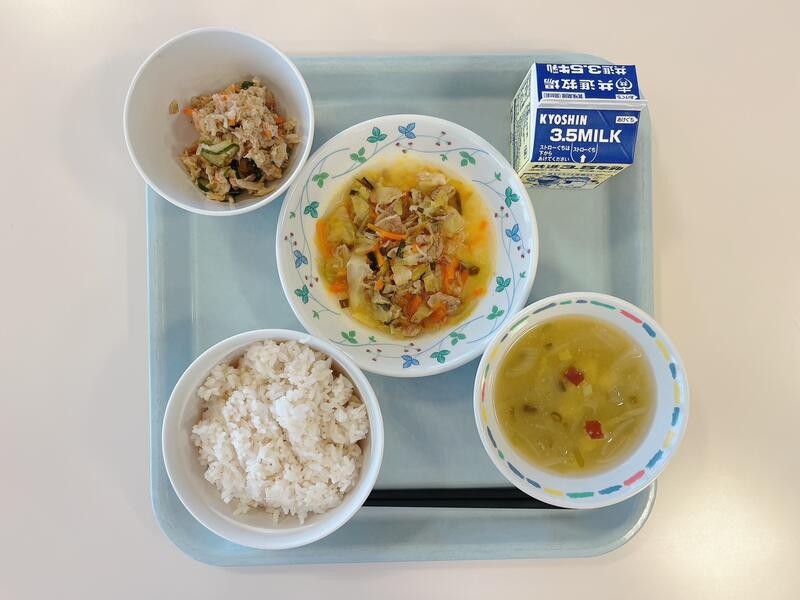 今日の給食は、目の愛護デー献立として、目の健康に良い食べ物を多く取り入れました。