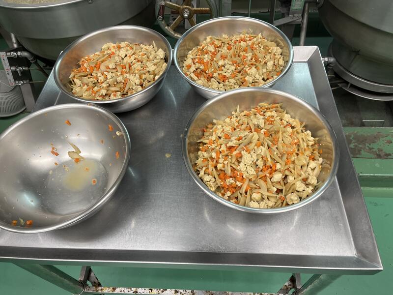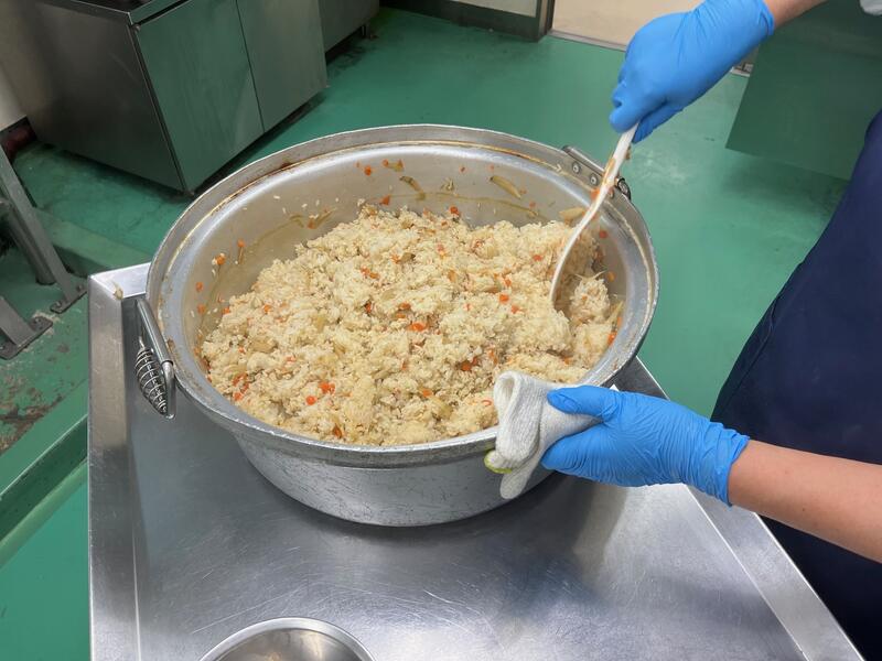 給食では、だしとしょうゆでご飯を炊き、具は別に炒めて調味し、最後に混ぜ合わせました。