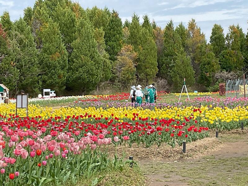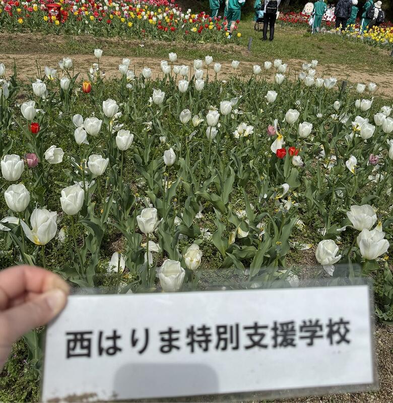 昨年度に先輩たちが植えたチューリップを探したり、学年やクラスでたくさん写真を撮ったりしました。西はりま特別支援学校が植えた花の色は、「白」でした。満開のチューリップを見学して「楽しかった。」や「綺麗だった。」という感想がたくさんありました。