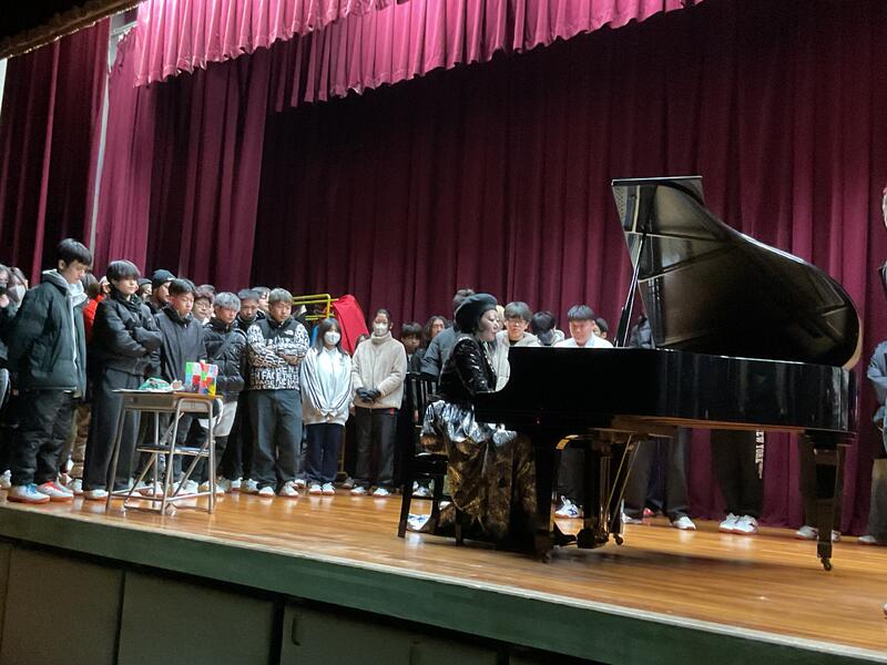 本校は、今年度より「高校生心のサポートシステム実践・研究」に取り組んでいます。この実践・研究の一環として、牧村 英里子様を講師としてお招きして、「日本の10代・世界の10代」という題目でご講演をいただきました。牧村英里子様は世界的に活躍されているピアニストであり、世界各国でのご経験をもとに、世界各国でのエピソードやそれぞれの国、出会った人への思い、生徒に伝えたい思いをピアノ演奏とともにお話しいただきました。最後には、全校生徒をステージに招き、ピアノ演奏を披露してくださいました。生徒にとって本当に貴重で有意義な機会となりました。心より感謝申し上げます。