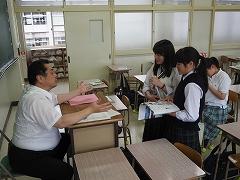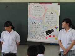 9名の留学生の方々にお越しいただいて、お話をさせていただきました。最初は緊張して人見知りしていた生徒たちも、流ちょうな日本語で、興味深い話をしてくださる留学生の方々を前にして、だんだん積極的に質問するようになりました。テーマに沿って事前に準備していた質問に加え、お話をする中でわいてきた疑問などをその場でぶつけるというような場面も見られました。さらに、生徒側から質問が出なくなると、逆に留学生の方たちから質問していただいて、話が盛り上がるというようなこともありました。