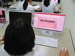 講座を選択している生徒たちは、これまで週一回、「海外から見た日本とは、どんなものなんだろう」ということをテーマに調べ学習をしてきました。8つのグループがそれぞれ異なったテーマを設定し、インターネットや新聞を活用して知識を深めました。