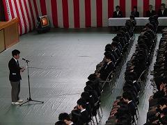 菊富友一会長より祝辞を述べられたのち188名の入会が認められました。また生徒代表 西村陸駆に同窓会より記念品として印鑑が贈られた。