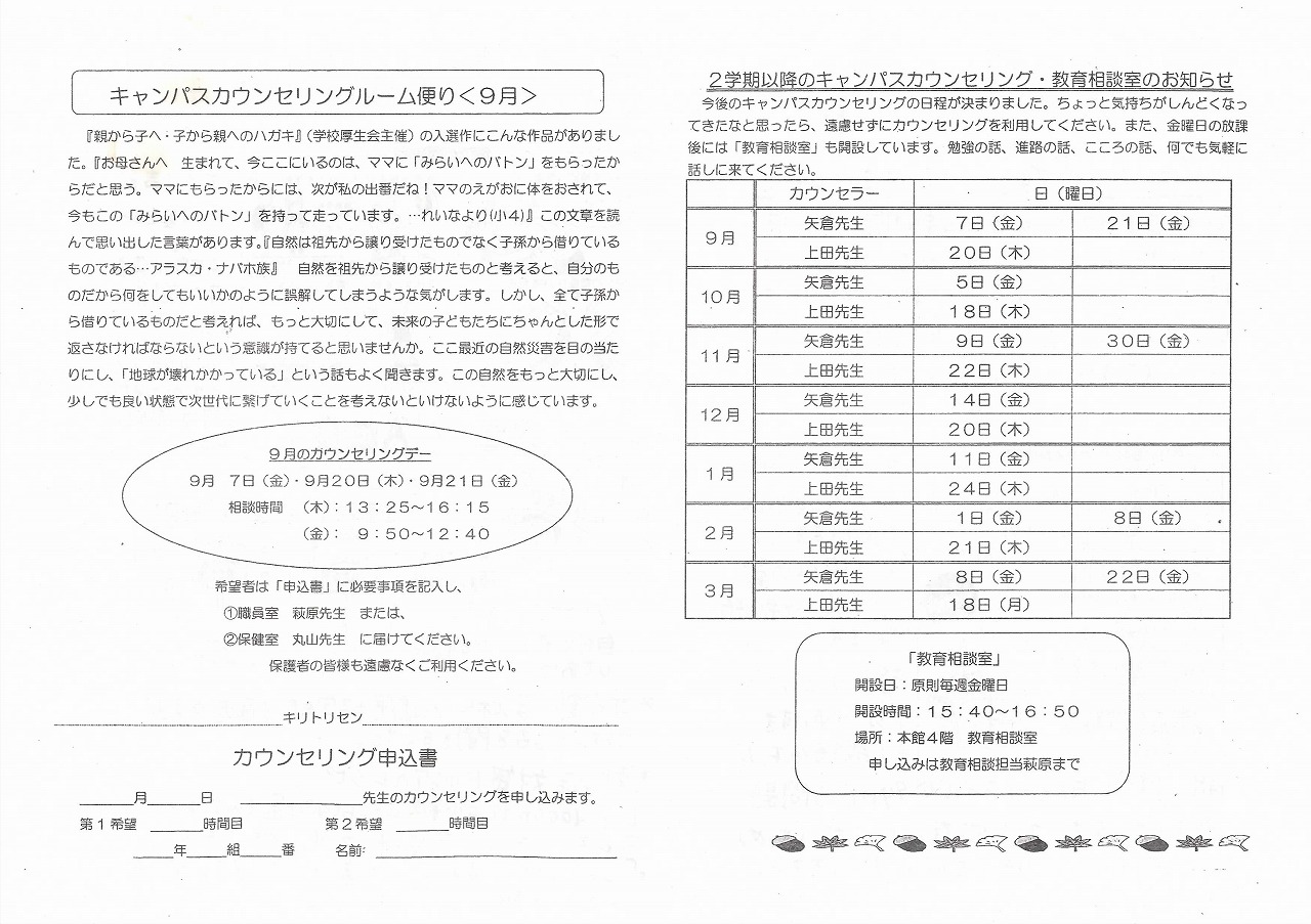 カウンセリングルーム便り(令和3年度のカウンセリング年間計画)をこちら掲載しました。