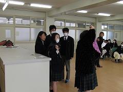 昼食後はキャンパス内の見学でした。飲食可能の図書館内、教材のオブジェなどを見、教員採用試験に関する資料が閲覧できるキャリア支援室を訪れました。最後に在学生との交流があり、受験体験や大学生活についてのお話をうかがいました。生徒たちは興味津々で、「勉強中の誘惑の撃退法は?」「将来の夢に迷ったときはどうしたらよいか?」など、次々に質問を投げかけ、実りのある交流ができました。