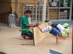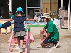 保育士さんとともに園児たちと遊具で遊ぶ本校生も半ズボンです。