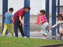 ヨーヨーすくい、宝物さがし、スタンプラリー、ボーリングなどのゲームを楽しむ園児との交流に生徒たちはプレゼントを渡したり、ヨーヨーを受け取ったり、大忙しのボランティアでした。生徒たちは「幼稚園児かわいい。」「幼稚園の先生の仕事はハードだ。」などとさまざまな感想を持ったようです。普段の実習とは異なる園の様子を体験でき、有意義な時間を過ごすことができました。