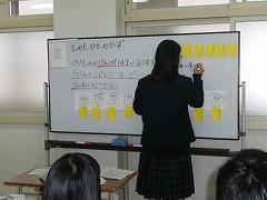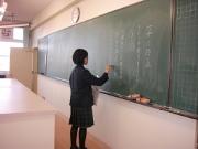 課題研究の内容は小学校学習指導案の作成です。今回は自分が作成した学習指導案に基づいて7分間の模擬授業を行いました。準備してきた教具を用いながら全員が精一杯授業を行い、授業終了後は緊張が解け自然と笑顔がこぼれていました。